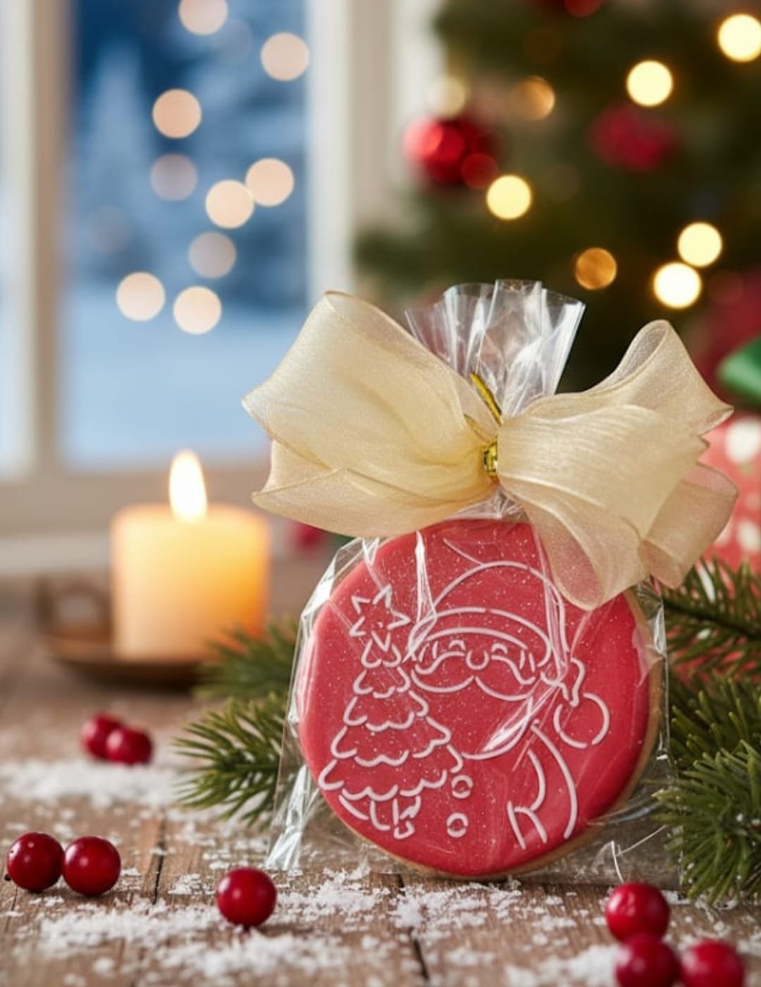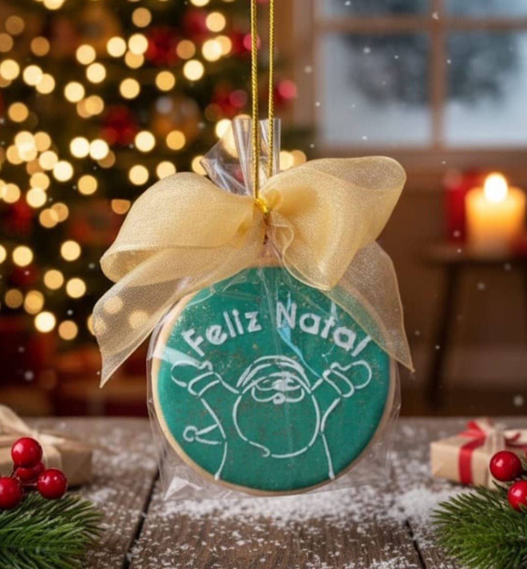 - Seis biscoitos redondos com decoração simples, prontos para serem pendurados e ajudar a decorar a sua árcore de Natal. Com laço e elásticos, um enfeite únido e saboroso.